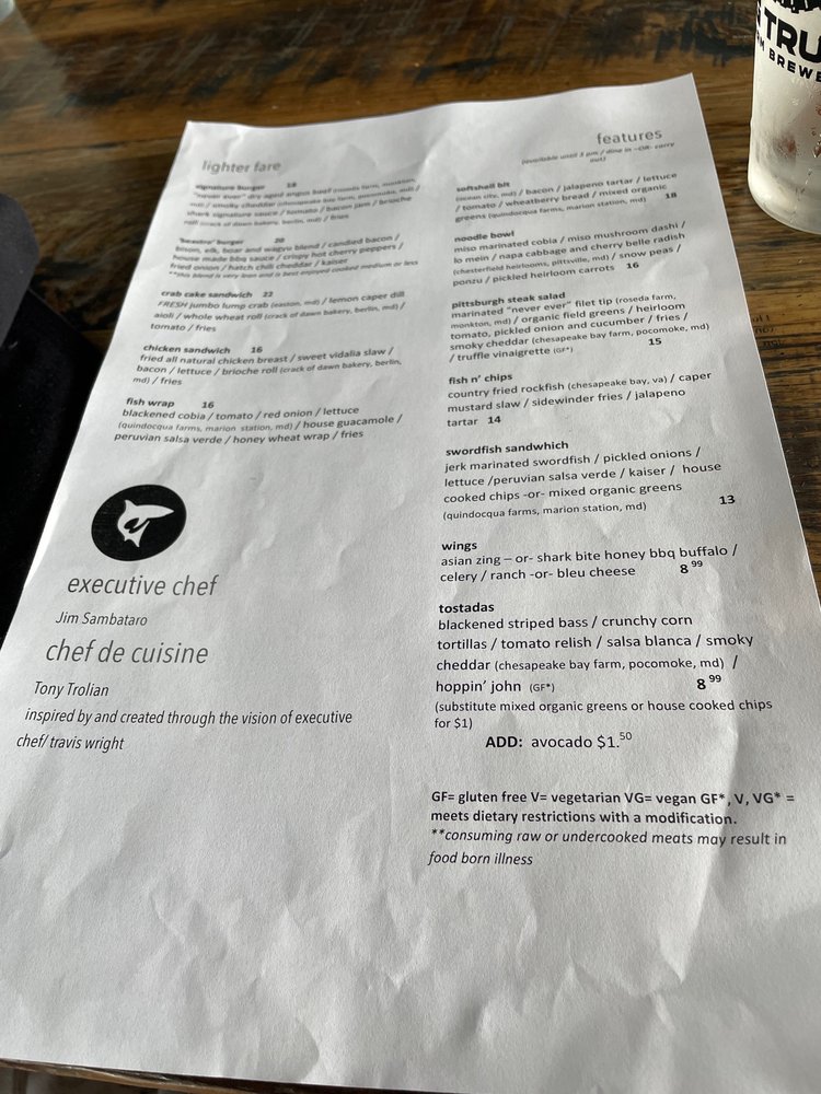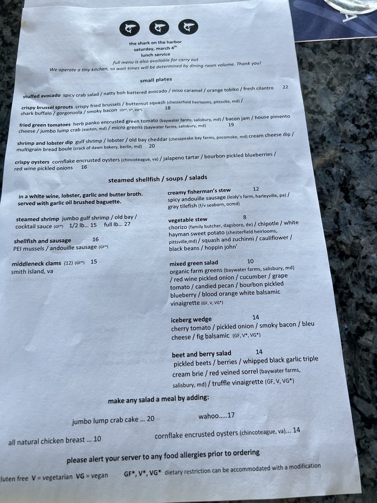 The Shark on the Harbor Menu