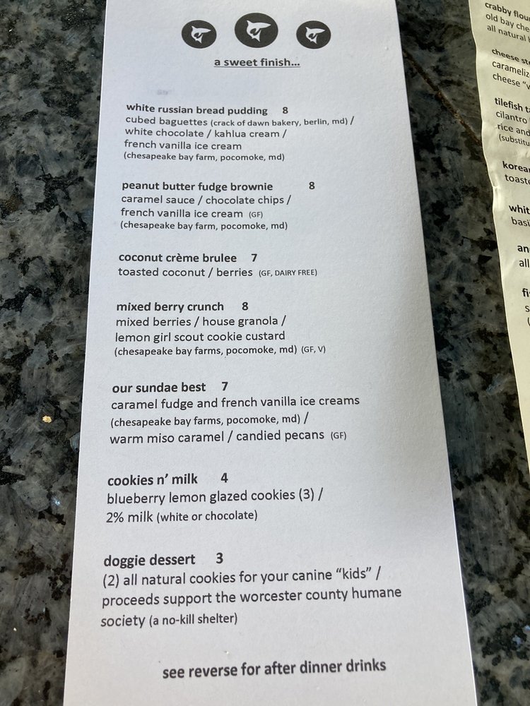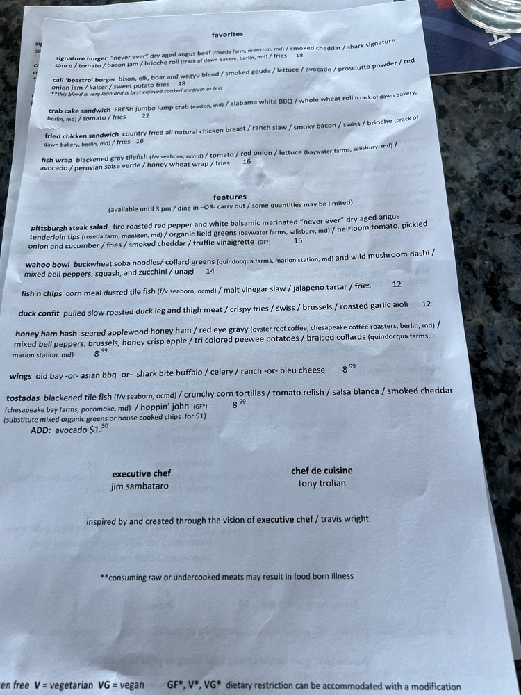 The Shark on the Harbor in Ocean City, MD offers a unique dining experience within the New American Seafood category. With a variety of small plates like Stuffed Avocado and Shrimp And Lobster Dip, the menu showcases innovative flavors using local ingredients. Their salads and soups, such as the Beet And Berry Salad and Fisherman's Stew, are a refreshing blend of fresh produce and seafood. For lunch, favorites include the New Orleans Shrimp N' Grits and the Stinky Beach Flatbread Pizza. The restaurant also provides vegan options and caters to various dietary needs. The relaxed atmosphere, along with outdoor seating and happy hour specials, make it an ideal spot for groups and families. The Shark on the Harbor is a must-visit destination for seafood lovers seeking a memorable dining experience.